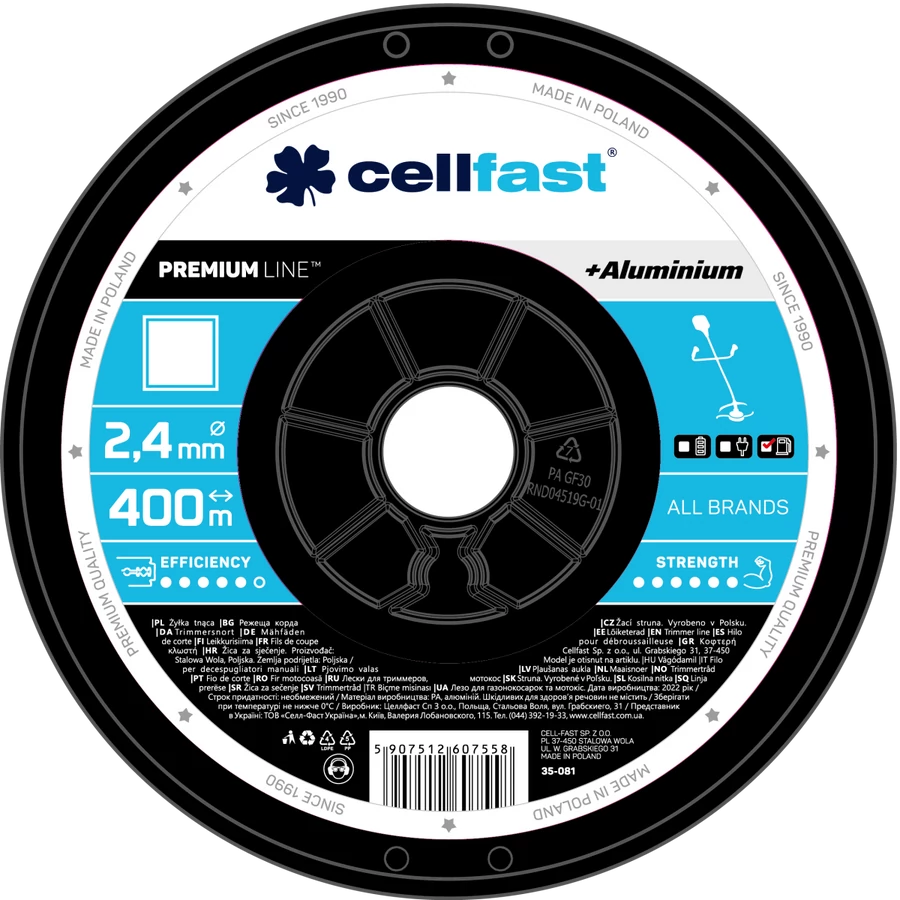 Ismerje meg a CELLFAST PREMIUM damilt a nagy, 400 méteres tekercsben, amely ideális választás professzionális felhasználók és nagy területek karbantartásához. Az alumíniumrészecskékkel megerősített szerkezet garantálja a kiváló vágási teljesítményt és a hosszú élettartamot.